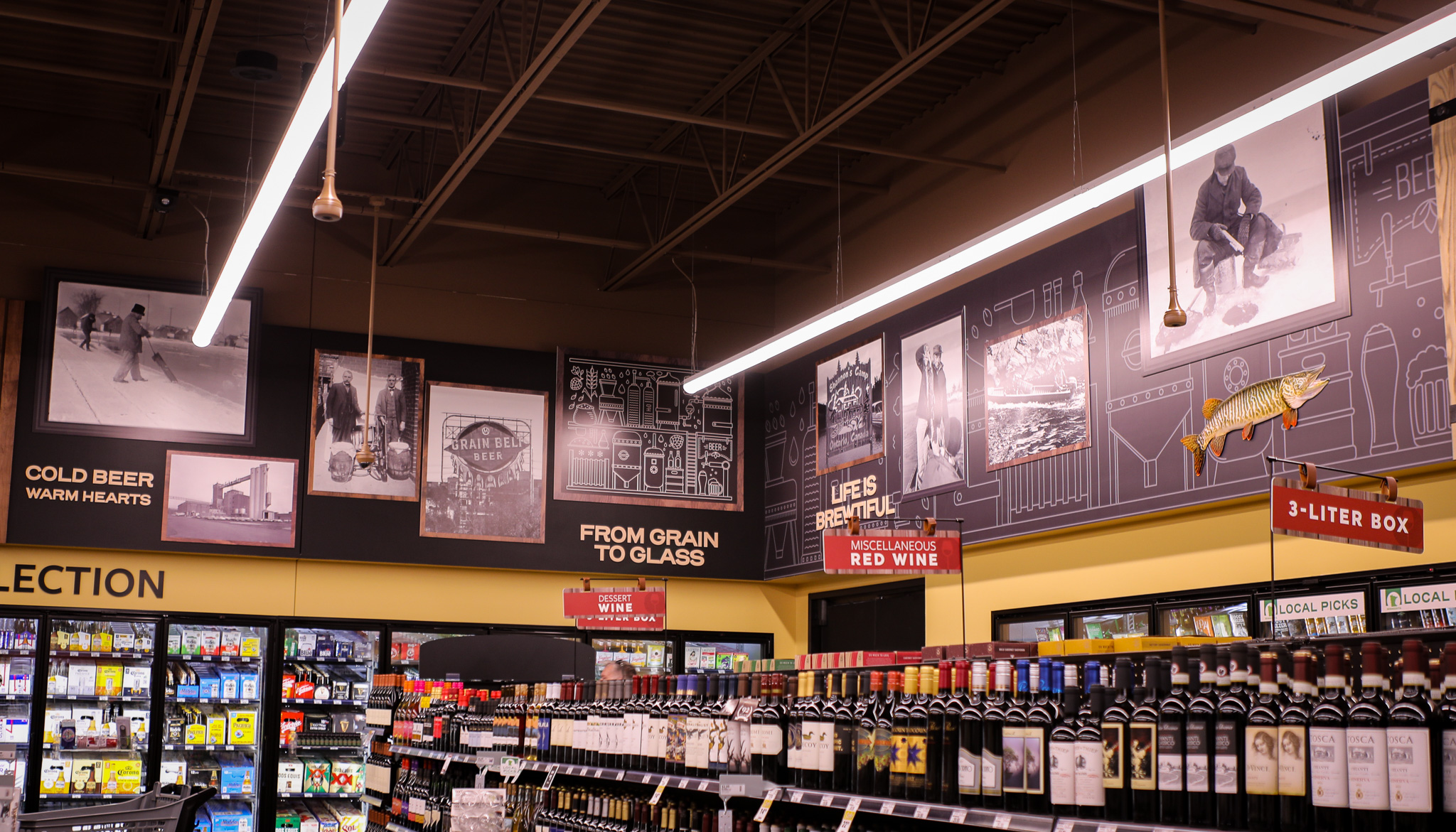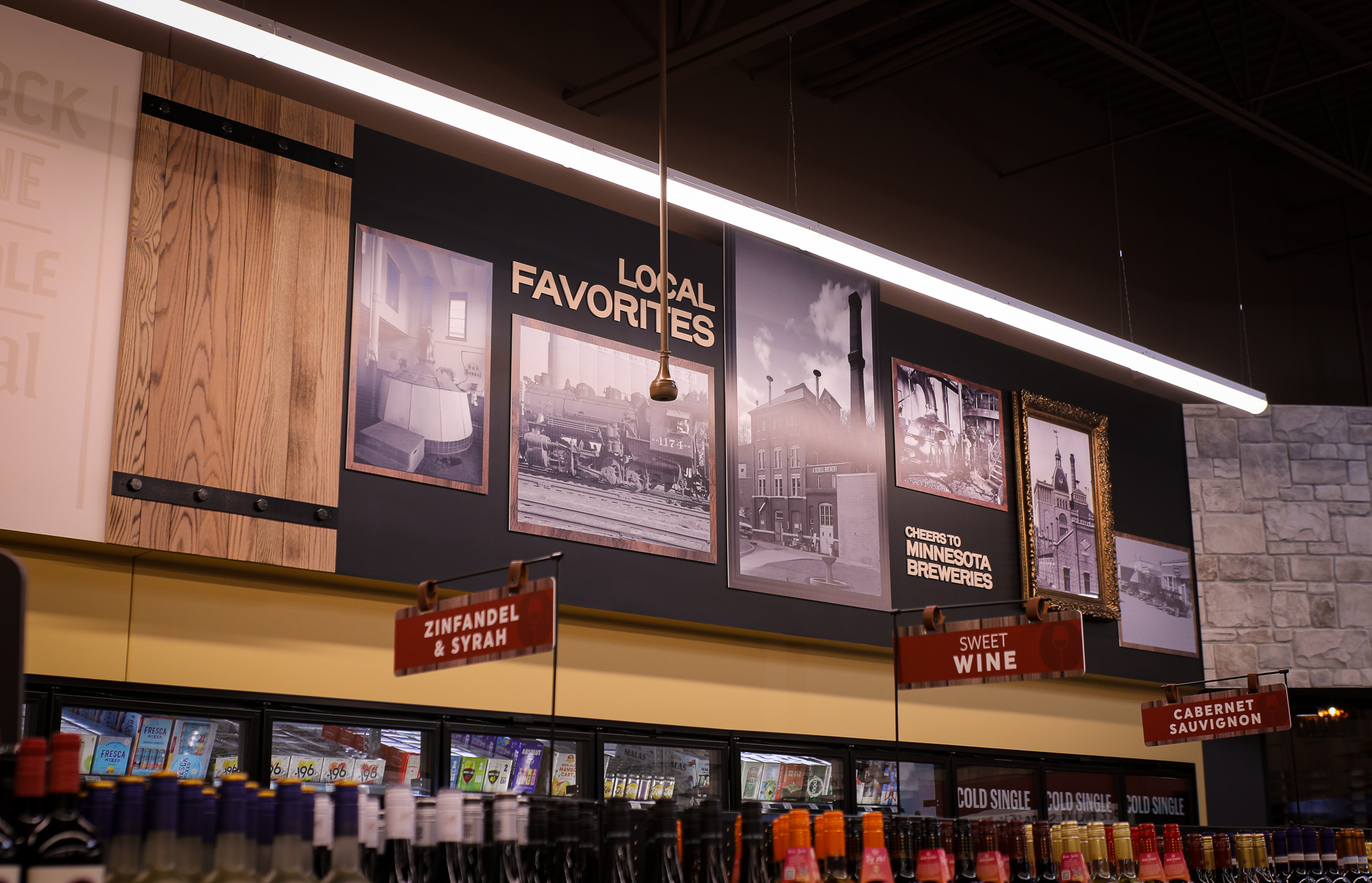 Coborn’s Wine & Spirits was designed as a refined extension of the Market & Table experience—bringing a more elevated, curated approach to beverage retail. Through a combination of strategic branding, environmental design, and immersive storytelling, the space balances premium positioning with approachability. From concept through installation, every detail was crafted to create a distinct yet connected experience within the broader flagship environment.